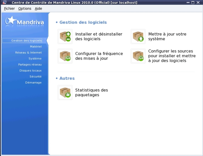 On accède à RPMdrake par le menu de Mandriva via Outils > Outils systèmes > Configurer votre ordinateur. Loguez vous en root, et vous arrivez dans l'onglet « Gestion des logiciels », soit RPMdrake.