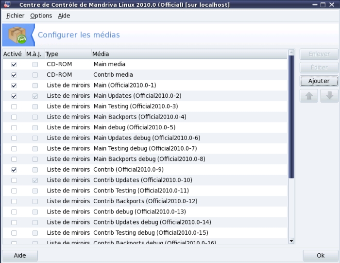 Choisissez « Configurer les sources pour installer et mettre à jour des logiciels », puis cliquez sur « Ajouter », puis « Jeu complet de sources ». L'outil drakrpm-edit-media va ajouter toutes les dépôts internet officiels, et vous afficher une liste de dépôts sélectionnables.