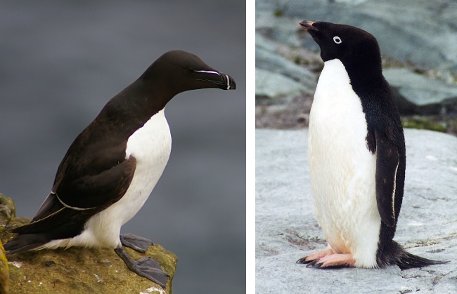 (ci-dessus, à gauche, un petit pingouin et à droite, un manchot Adélie.)