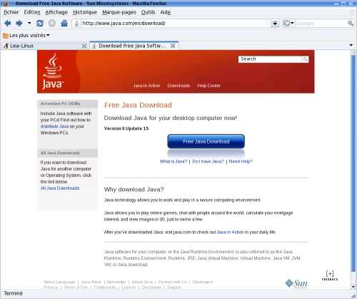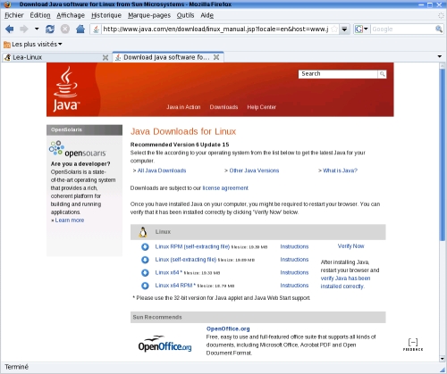 Dans certaines distributions, comme Ubuntu ou Mandriva, il existe un paquet logiciel nommé sun-java6-plugin ou java-1.6.0-sun-plugin ou quelque chose de ressemblant. Il existe aussi un paquet d'OpenJDK, une implémentation complète, validée, entièrement libre de java. Dans ce cas, le paquet se nomme icedtea6-plugin ou quelque chose de ressemblant. Installez de préférence un de ces paquets, suivant la procédure habituelle. Il est possible que la première fois que vous chargez une application java, on vous demande de choisir un répertoire temporaire : choisissez /tmp