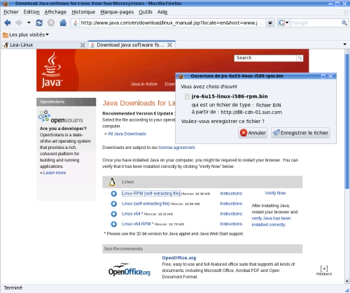 Une boîte de dialogue s'ouvre et vous propose de télécharger le lecteur java. Téléchargez-le par exemple dans /tmp.