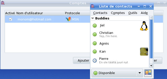 Pidgin : Pidgin (anciennement Gaim) est un logiciel libre client de messagerie instantanée multiprotocole et multiplate-forme : il fonctionne sous GNU/Linux, BSD mais aussi Windows et Mac OS X. Il est très populaire et c'est lui qui a été choisi pour cette fiche. Sachez cependant que ses principaux concurrents sont Kopete, ou aMSN (qui ne gère que Windows Live Messenger). Si vous utilisez Gaim - sur une vieille distribution par exemple -, veuillez vous référer à la fiche Comment utiliser MSN avec Gaim.