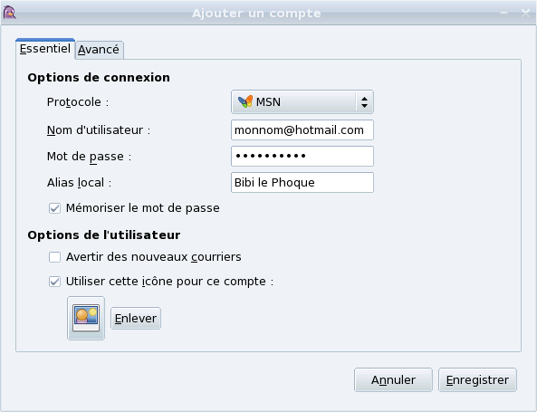 - Vous pouvez maintenant cliquer sur « Ajouter » et configurer votre compte en suivant la configuration visible ci-dessous. Dans « Protocole », choisissez « MSN ». Dans « Nom d'utilisateur », mettez votre compte WLM/MSN, typiquement toto@hotmail.com ou toto@msn.com.