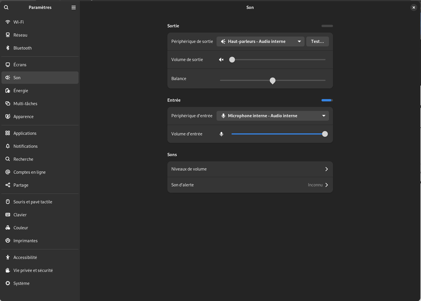 Le menu système dans la barre supérieure est accessible en cliquant sur l'icône Wi-Fi ou son (en haut à droite). En cliquant sur la roue qui va apparaître, vous entrez dans les paramètres qui vous permettent de modifier les paramètres réseaux, le volume ou la luminosité de l’écran, mais aussi vérifier la charge de la batterie, vous déconnecter ou changer d’utilisateur et éteindre votre ordinateur.
