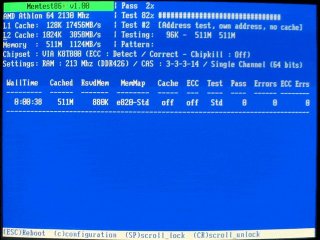 La figure ci-dessus, est une capture d'écran de memtest en fonctionnement. Le barre de progression principale affichée en haut à droite de l'écran (2% dans cet exemple) permet de suivre la progression du test. Les erreurs apparaissent dans la partie inférieure de l'écran. Il suffit de laisser fonctionner memtest au moins une fois jusqu'à 100%. Si aucune ligne ne s'est affichée alors vou pouvez considérer que la mémoire est fonctionnelle. Dans le cas contraire, il faudra soit procéder à son remplacement s'il s'agit d'une seule barrette mémoire, soit tester les barrettes indépendamment (l'une puis l'autre) avec ce logiciel. Dans le cas de 2 ou 3 barrettes qui ne fonctionnement pas correctement ensemble mais qui fonctionnement correctement individuellement, il faudra vérifier qu'elles sont bien de même modèle/marque et remettre le Bios dans une configuration initiale.