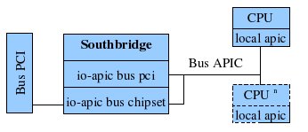De plus le Local APIC (LAPIC) inclut un « timer » de précision cadencé à la fréquence du bus, généralement il peut être utilisé par l'ordonnanceur de votre système d'exploitation favori ou d'autres outils de haut niveau (profiler kernel : oprofile, vtune). Les LAPIC et l'IO-APIC sont reliés par un bus spécifique pour permettre un échange rapide des informations.