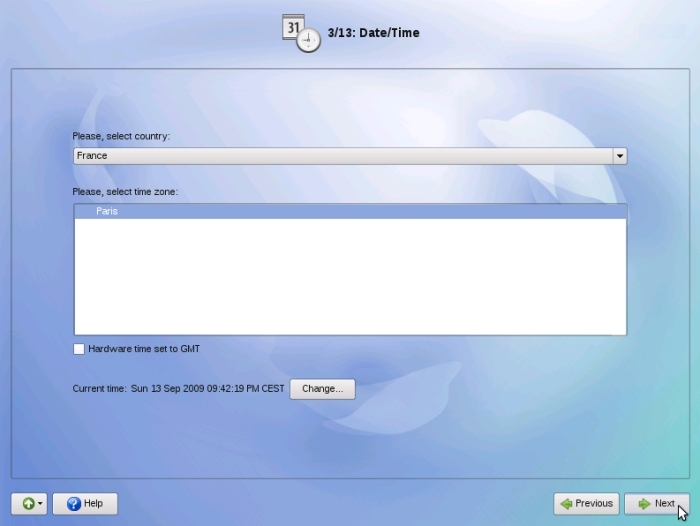 Sélectionnez votre fuseau horaire. Cochez la case « Harware time set to UTC » si l'horloge système de votre ordinateur utilise le temps universel coordonné (UTC) ; dans le doute, laissez par défaut. Cliquez ensuite sur « Next ».