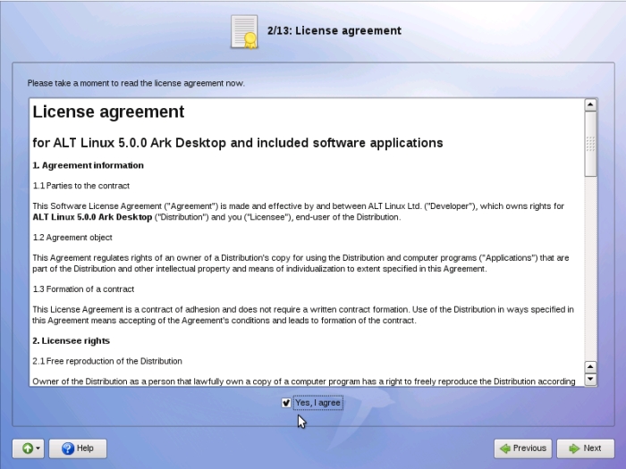 Lisez, puis si vous êtes d'accord avec la license, cochez la case en bas et cliquez sur « Next ». On notera qu'ALT contient des pilotes propriétaires pour le matériel (cartes vidéos, WiFi, modems) ansi que le plugin propriétaire Flash d'Adobe ; le reste est du logiciel libre.