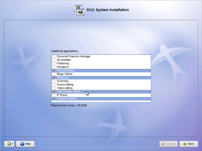 Choisissez ensuite les familles de logiciels qui vous intéressent. Il vous est indiqué en bas la place que prendra le système après installation sur votre disque dur. Si vous avez de la place, vous pouvez tout sélectionner (cela prendra environ 4 Go). Cliquez ensuite sur « Next ».