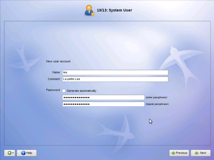 Il faut également créer un compte utilisateur pour l'utilisation courante de votre système. Choisissez un identifiant de connexion et un mot de passe, et cliquez sur « Next ».