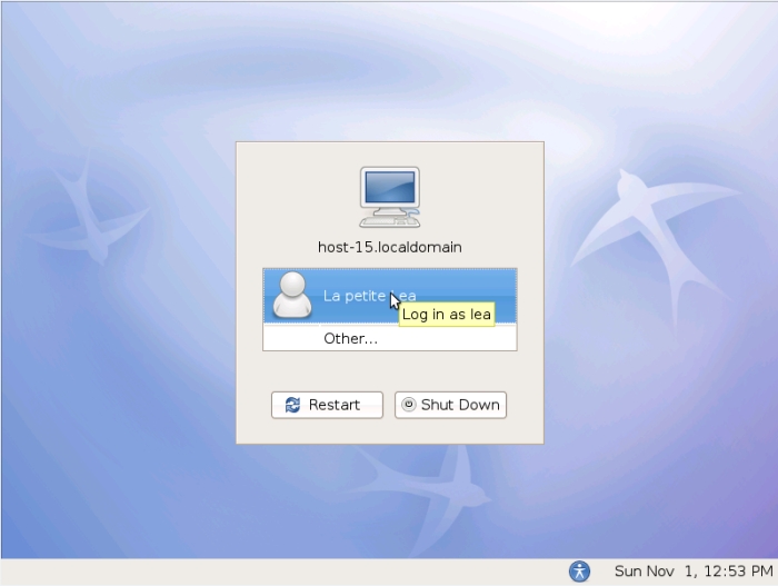 Après le redémarrage, vous arrivez à la fenêtre suivante. Pour modifier la langue et le clavier utilisé par défaut, vous pouvez le faire au moment de se loguer dans fenêtre de login. Renseignez les champs « Language » (« langue ») et « Keyboard » (« Clavier »). Et maintenant, loguez-vous, et profitez d'ALT !