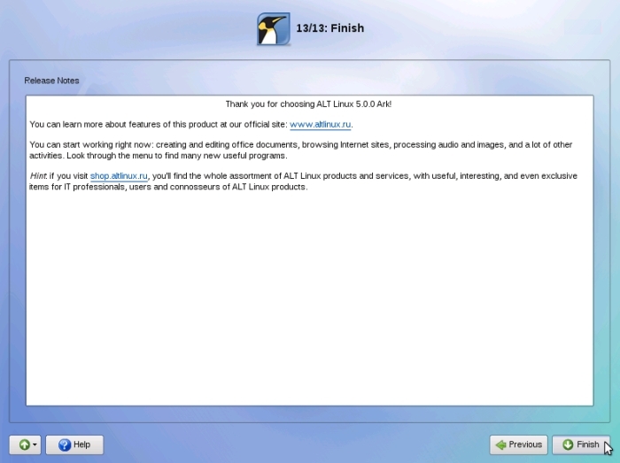 L'installation est terminée ! Vous n'avez plus qu'à redémarrer votre ordinateur en cliquant sur « Finish ». Enlevez le DVD du lecteur, cliquez sur « ALTLinux » et voici votre système ALT qui démarre !
