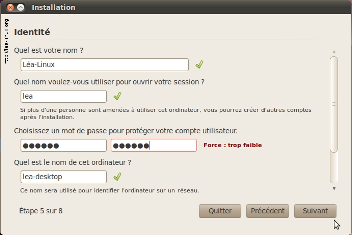 Choisissez votre login utilisateur et votre mot de passe. Si ce dernier est trop faible, l'installeur d'Ubuntu vous l'indiquera. Pensez alors à mettre des lettres, des chiffres et des caractères spéciaux dans votre mot de passe. Cliquez sur « Suivant ».