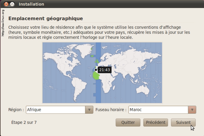 Choisissez votre emplacement géographique qui va déterminer votre fuseau horaire, et cliquez sur « Suivant ».