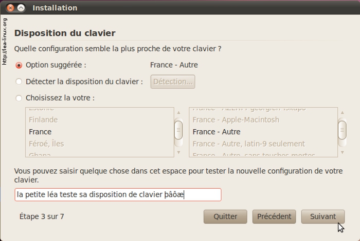 Choisissez maintenant votre disposition de clavier. Ubuntu vous en propose une en fonction de vos choix de langue et de fuseau horaire précédemment renseignés. Ainsi, dans notre exemple ci-dessus, Ubuntu propose « France - Autre ». Vous pouvez généralement laisser ce qui est proposé par défaut. Une petite zone en bas à droite permet de faire des essais. Essayez de voir si toutes les touches de votre clavier sont bien reconnues ! Cliquez ensuite sur « Suivant ».