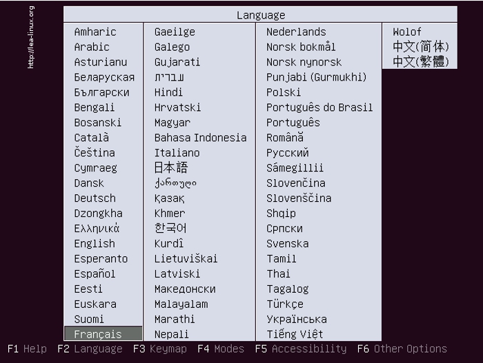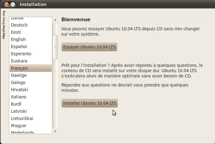 Etant donné que vous avez précédemment choisi d'installer Ubuntu en français, Ubuntu a déjà sélectionné la langue pour vous. Si cela n'est pas le cas, choissisez la langue. Cliquez sur « Installer Ubuntu 10.04 LTS ».