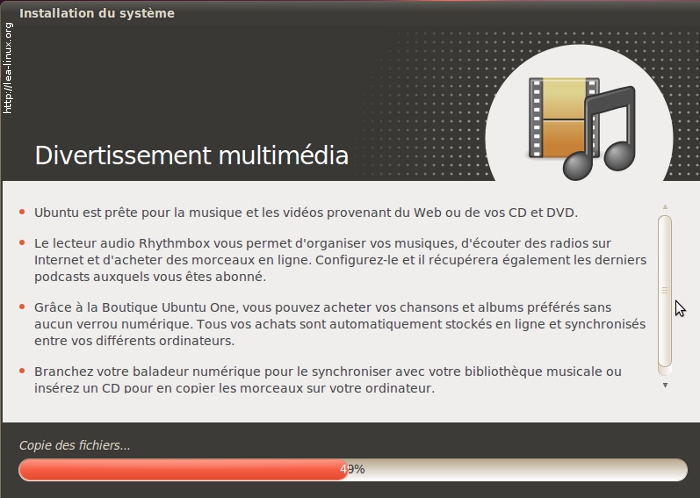 Ubuntu passe par plusieurs étapes, notamment le formatage des partitions puis l'installation du système et des programmes. Pendant l'installation, l'installeur vous affiche des informations utiles et d'autres à caractère plus... marketing ;-)