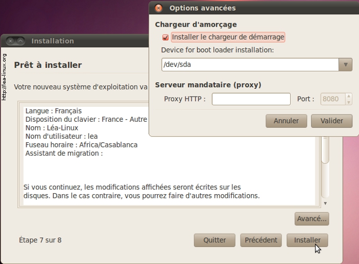 Il s'agit maintenant de vérifier si tout ce qu'on a saisi est bien correct. En cliquant sur « Avancé », vous pourrez sélectionner une autre partition que celle par défaut pour installer le programme d'amorce (boot loader), ce qui n'est pas forcément conseillé, ou choisir de participer aux statistiques d'utilisation des paquets. Si tout est bon, cliquez sur « Installer ».