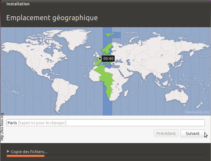 Choisissez votre emplacement géographique qui va déterminer votre fuseau horaire, et cliquez sur « Suivant ».