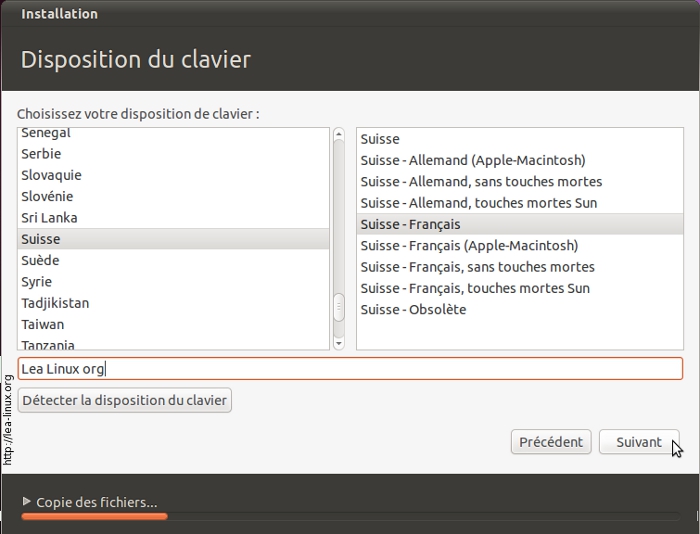 Ubuntu associe à certains pays plusieurs dispositions de clavier. Vous pouvez généralement laisser ce qui est proposé par défaut (ici « Suisse - Français »). Une petite zone en bas à droite permet de faire des essais. Essayez de voir si toutes les touches de votre clavier sont bien reconnues ! Cliquez ensuite sur « Suivant ».