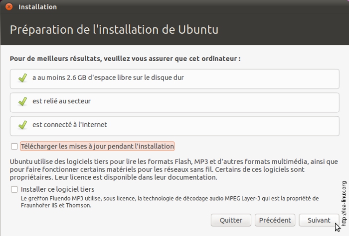 Ubuntu vous propose de télécharger des mises à jour pendant l'installation, afin notamment d'installer des logiciels propriétaires tiers (Flash, MP3). Si vous êtes un utilisateur lambda qui veut juste que tous ses programmes marchent, cochez ces cases. Si vous ne souhaitez utiliser que du logiciel libre, laissez-les décochées. Vous pourrez dans tous les cas installer ces logiciels par la suite. Cliquez ensuite sur « Suivant ».