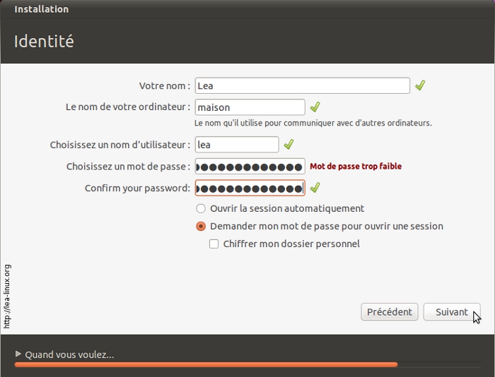 Choisissez votre login utilisateur et votre mot de passe. Si ce dernier est trop faible, l'installeur d'Ubuntu vous l'indiquera. Pensez alors à mettre des lettres, des chiffres et des caractères spéciaux dans votre mot de passe.