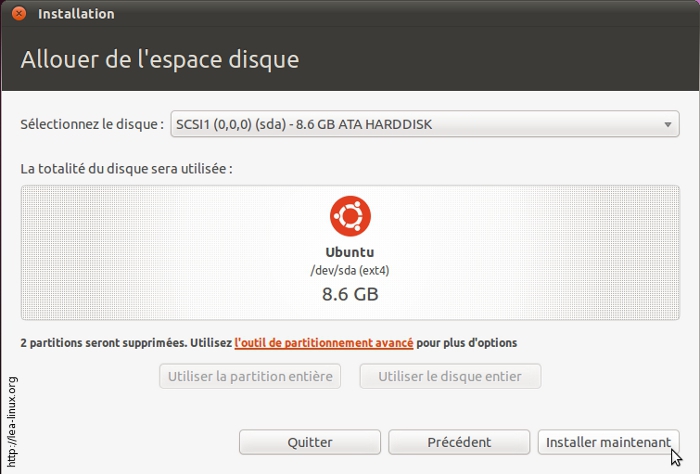 L'installeur vous affiche éventuellement les partitions qui seront supprimées (par exemple si vous aviez choisi « Tout effacer et utiliser le disque entier »). Seulement si cela vous convient, cliquez sur « Installer maintenant ». A ce moment là, le formatage commence.