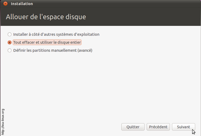 - Si vous voulez supprimer votre système existant ou que votre disque dur est vide, choisissez « Tout effacer et utiliser le disque entier ».