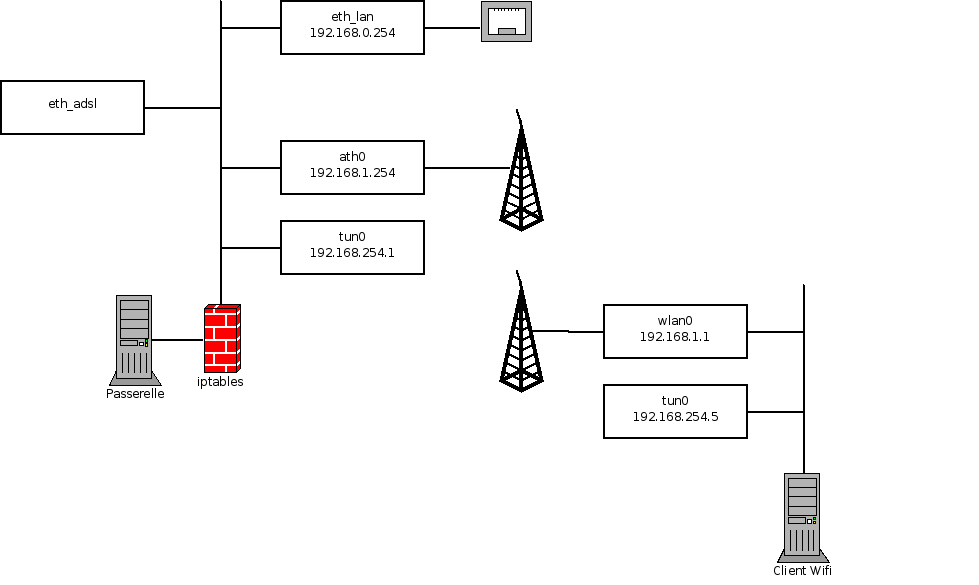 - Un PC (passerelle pour le reste du document) connecté directement à la freebox sous Debian/testing. Elle dispose de deux cartes réseau Ethernet RJ45 (filaire) qui sont identifiées par l'OS en tant que eth_adsl et eth_local. La freebox est reliée sur eth_adsl. Un firewall tourne entre eth_adsl et eth_local à l'aide d'iptables.