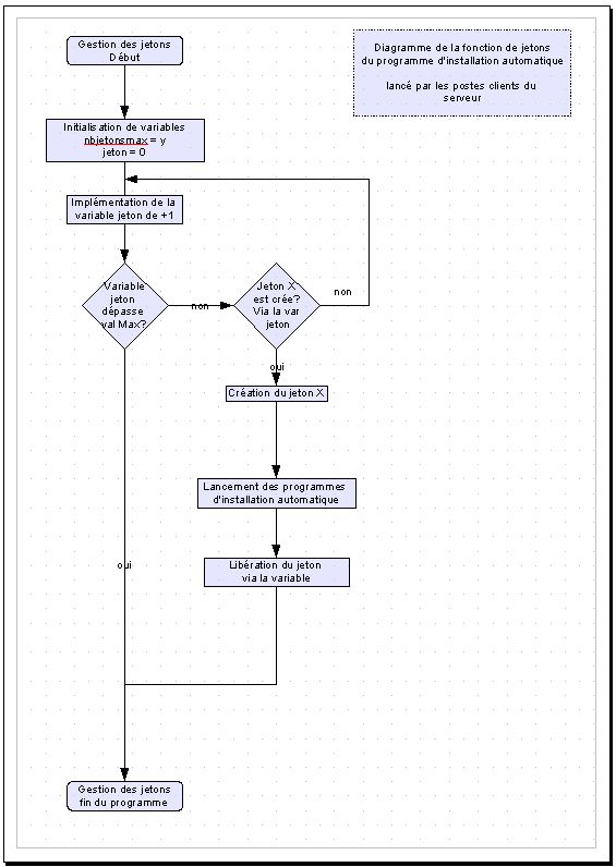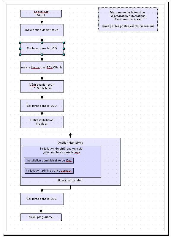 rem ------------------------------------------------------ echo Vérification du jeton %jeton% echo %USERNAME%,%COMPUTERNAME% > %TEMP%\jeton%jeton% rem ------------------------------------------------------ echo lancement des programmes d'installation administratives rem pause rem exemple : if NOT EXIST "%ProgramFiles%\install_log\ooo-202.log" (echo installation de Ooo en cours & echo %date%,%time%,%USERNAME%,%COMPUTERNAME%,installation de Ooo en cours>>%log_path% & start /WAIT H:\autoinstall\client\Standart\openoffice\install-jre-Ooo.bat) ELSE (echo instalation de Ooo n'est pas a faire & echo %date%,%time%,%USERNAME%,%COMPUTERNAME%,instalation de Ooo n'est pas a faire>>%log_path%) rem exemple : c'est un peut long et j'ai pas mis mes variables d'installation dans cette exemple rem exemple : mais je lui demande de faire une commande SI, des log de l'installation et de lancer ou pas le fichier « install-jre-Ooo.bat » echo . echo . rem ------------------------------------------------------ echo Liberation du jeton Numero %jeton% rem del "%path_jeton%\jeton%jeton%" del "%TEMP%\jeton%jeton%"