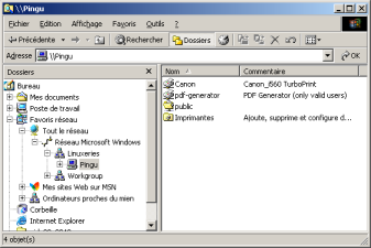 - partage de la ressource (partage intitulé [printers]), mais qui nécessite d'avoir installé les drivers sur le poste client,