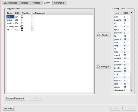 Renouvelez l'opération pour chaque utilisateur devant accéder au serveur Samba.