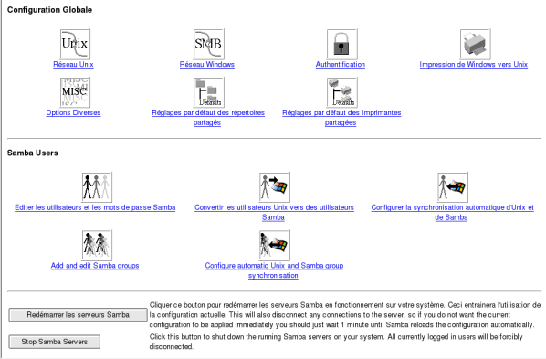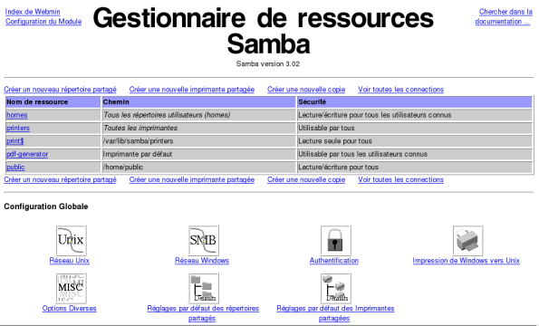 Webmin est un utilitaire accessible par interface web qui va vous permettre de configurer l'ensemble de votre machine (système et réseau). Il est constitué d'un ensemble de modules dont celui consacré au serveur Samba.