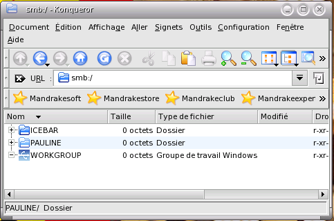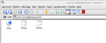 Konqueror est maintenant un bon moyen d'accéder à un serveur Samba, il suffit pour cela de taper dans la zone URL smb://user@serveur/ ou smb://user:password@serveur/ pour accéder au serveur "serveur" en tant que "user".