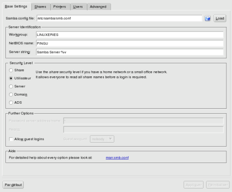 Il existe de nombreux outils graphiques qui vont vous permettre de procéder aux mêmes manipulations mais sans utiliser d'éditeur de texte. Les intitulés des actions à réaliser reprennent généralement les mêmes dénominations que les paramètres utilisés dans le fichier smb.conf décrit ci-dessus.