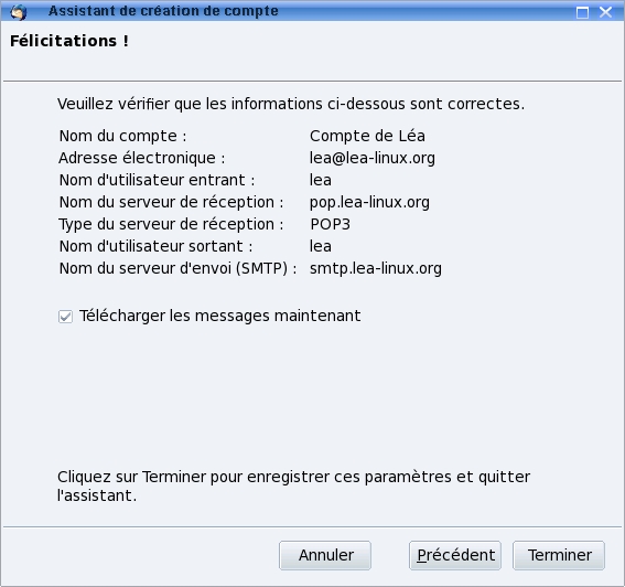 Vérifiez que les informations que vous avez rentrées sont exactes, et validez en cliquant sur « Terminer ». Votre compte de messagerie est créé! Recommencez ces opérations autant de fois que vous avez de comptes à créer.