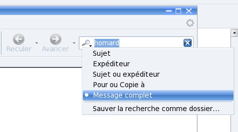 Par défaut, Mozilla Thunderbird recherche sur le sujet ou l'expéditeur. Pour chercher dans d'autres champs, cliquez sur la petite loupe. D'autres types de recherche apparaissent, tels que la recherche dans le corps du message, la recherche sur les personnes en copie etc.