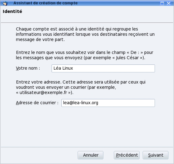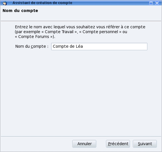 Donnez un nom au compte créé. C'est le nom qui apparaitra dans la fenêtre de paramétrage des comptes (Edition > Paramètres des comptes). Cliquez sur « Suivant ».