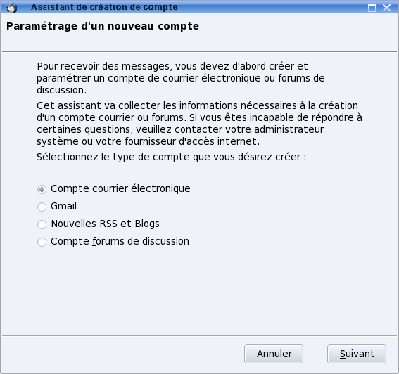 A son premier lancement, Mozilla Thunderbird devrait lancer automatiquement « Assistant de création de compte ». Sinon, allez dans Edition > Paramètres des comptes, et cliquez sur « Ajouter un compte ». L'assistant se lance :