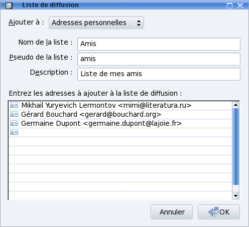 Il ne vous reste qu'à donner un nom à la liste, et entrer les adresses à ajouter à la liste de diffusion.