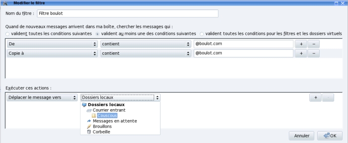 Allez ensuite dans le menu Outils > Filtres de message. Cliquez sur « Nouveau ». Il ne vous reste qu'à renseigner les motifs recherchés (par exemple @boulot.com) dans la ligne de formulaire de droite. Dans la partie basse « Exécutez ces actions », vous pouvez sélectionner la ou les actions à effectuer, dans notre cas précis, déplacer les messages correspondants aux critères de filtrage dans le dossier « Couscous ».
