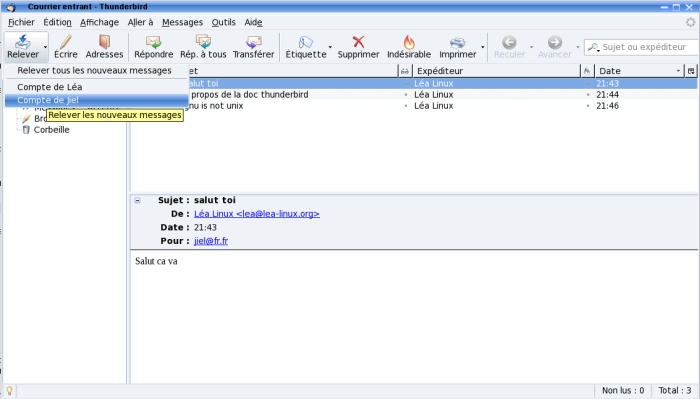 Vous avez la possibilité de ne télécharger les messages que d'un seul compte, en cliquant sur la flèche à côté de l'icone ci-dessus, ou dans le menu Fichier > Relever les messages pour, en sélectionnant le nom de compte désiré.
