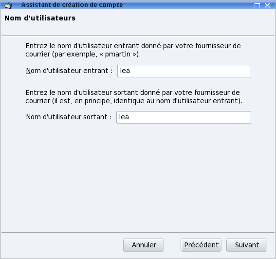 Renseignez le nom d'utilisateur de messagerie entrant, et le nom descendant. La plupart du temps, ils sont identiques et sont votre adresse de courrier électronique, ou la partie de l'adresse qui est située avant le signe « @ ». Ces deux champs étant renseignés, cliquez sur « Suivant ».