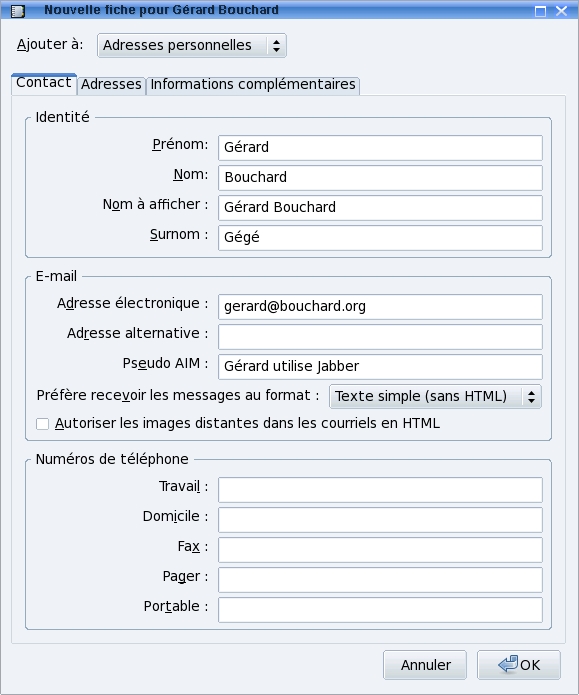 Il ne vous reste plus qu'à complétez les champs voulus et cliquez sur « Ok ». Votre contact est alors ajouté dans votre carnet d'adresse.